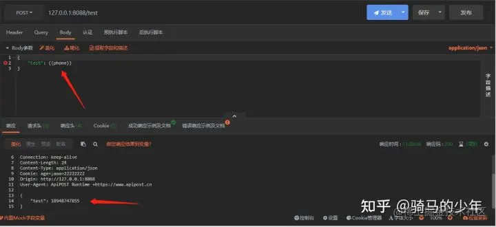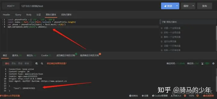我们也可以自定义mock变量,我们在接口的预执行脚本编写自定义的mock变量,我们自定义一个手机号,然后设置为环境变量或者全局变量