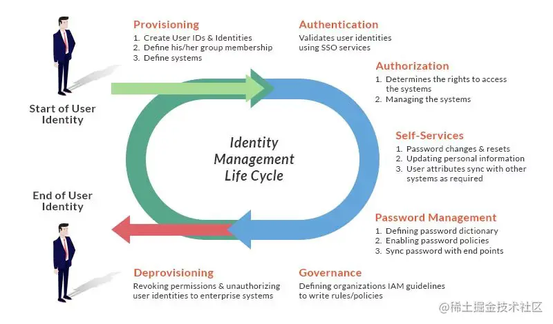 无论是医疗保健,金融还是其他领域,企业都使用IAM来遵守最佳实践和行业标准。简而言之,它可以自动化企业应用程序的用户生命周期,并实现与其他外部实体(如云解决方案和第三方应用程序)的信任。下图概述了IAM用户身份生命周期。