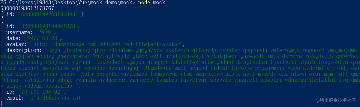 执行node命令,可以看到控制台输出了mock出来的假数据