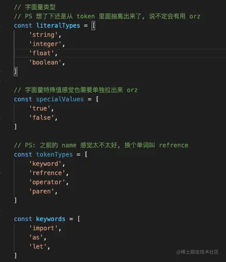 一共四种基本数据结构, 对应四种字面量的声明方式, 所以这次的小目标是要解析这么 8 行代码, 和上次比足足翻了 4 倍呢, 哇哦哦哦~(手动斜眼