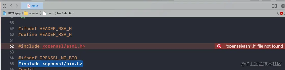 由于在项目中引入 openssl 库,出现这个问题是因为库文件项目无法找到,只需要在 Header Search Paths 中加入 $(PROJECT_DIR)/项目名称/openssl 即可,如下图操作: