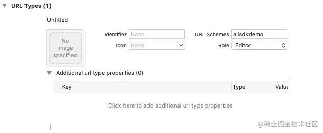 最后,不要忘了还要写一个 URL Scheme,在 Targets -> Info 下最后一个即可找到, 点击 “Info” 选项卡,在 “URL Types ”选项中,点击 “+”。