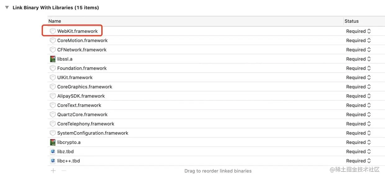 出现上面的问题,需要在项目配置中添加系统类库:WebKit.framework