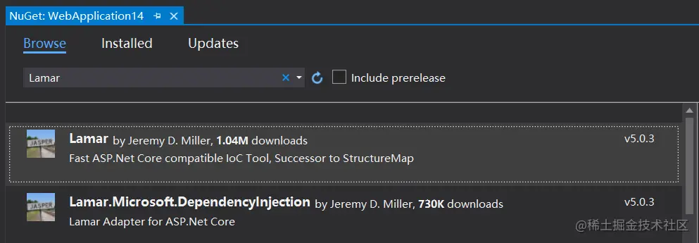 要想在 ASP.Net Core 中使用 Lamar,需要通过 nuget 安装如下两个包。