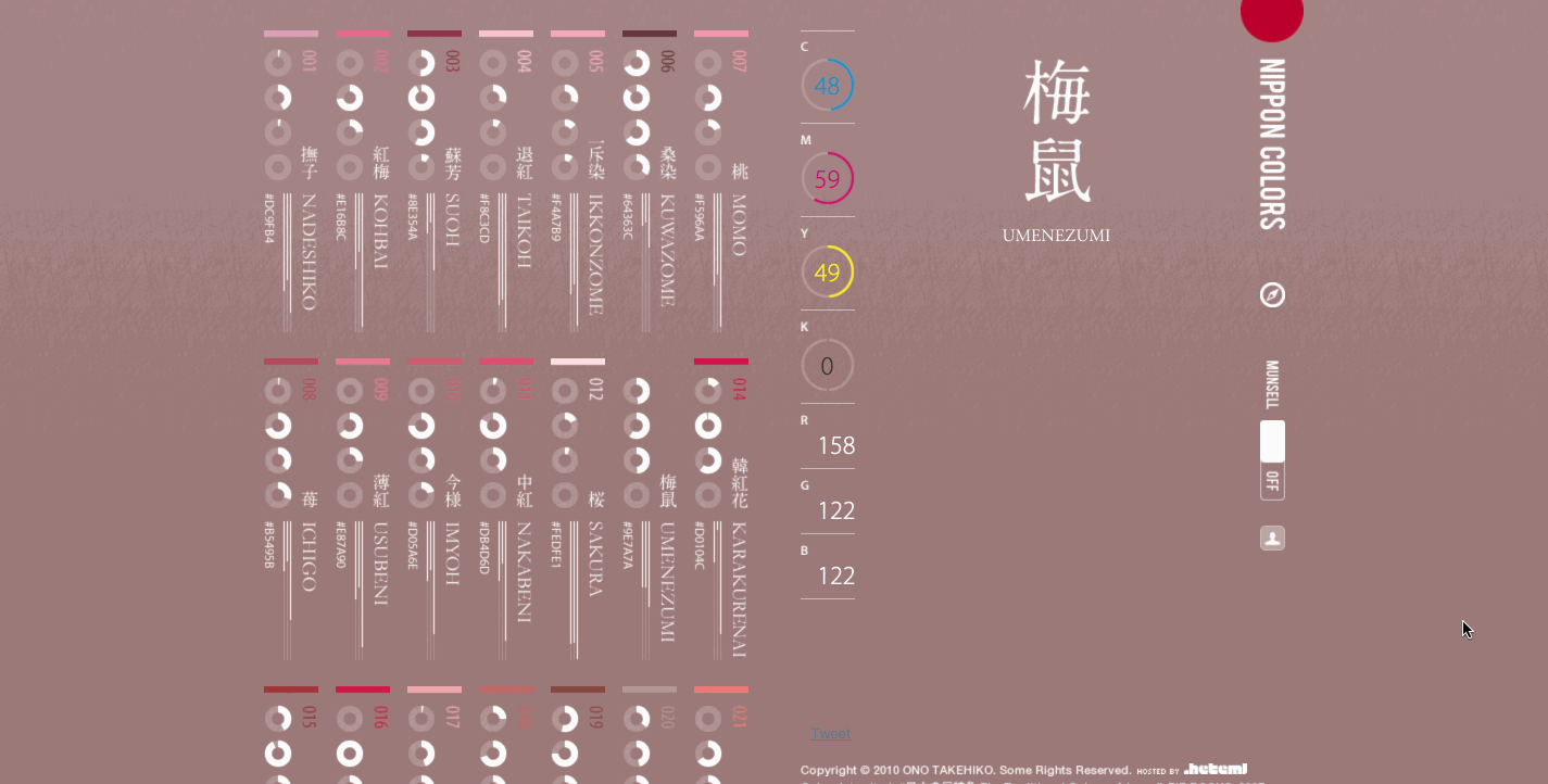 再扯点别的。说回 Nippon Colors 这个网站的,虽然古柳早些年就只知道这个网站,但还是第一次发现页面上有个Munsell模式的ON/OFF的切换按钮,开启后的3D效果真的有种难以言表的玄妙之感,如果你此前也不知道这个按钮,或许可以体验一番。