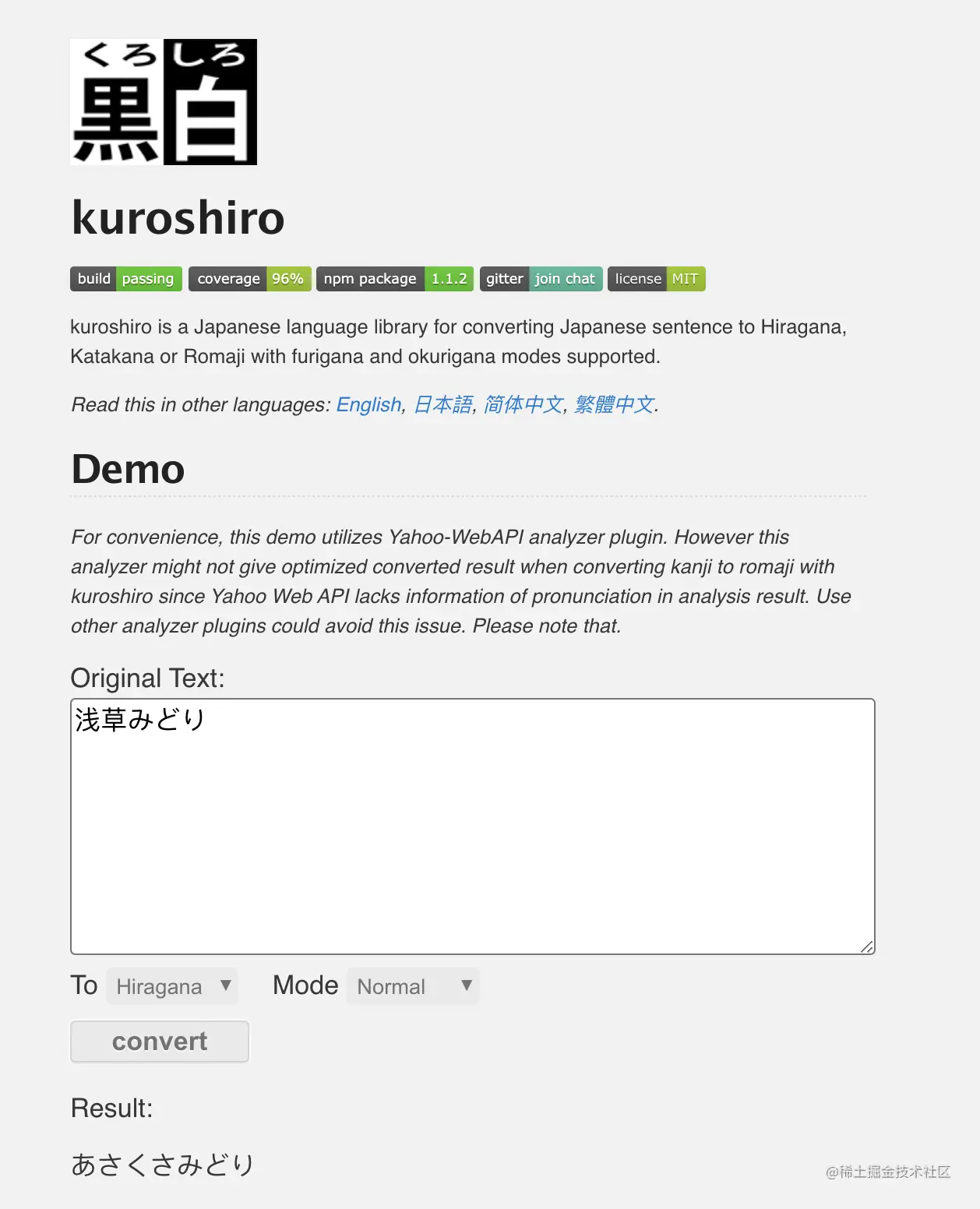 古柳总觉得加上平假名更好阅读(可能只是个人习惯或感觉,虽然不会日语,逃),于是搜了下日语相关的JS库,看到 黑白 kuroshiro 这个库似乎能帮上忙。思路大概是:将日文分别转换成平假名和罗马字,然后和现有罗马字匹配下看看准确度,可行的话就能补充上平假名。
