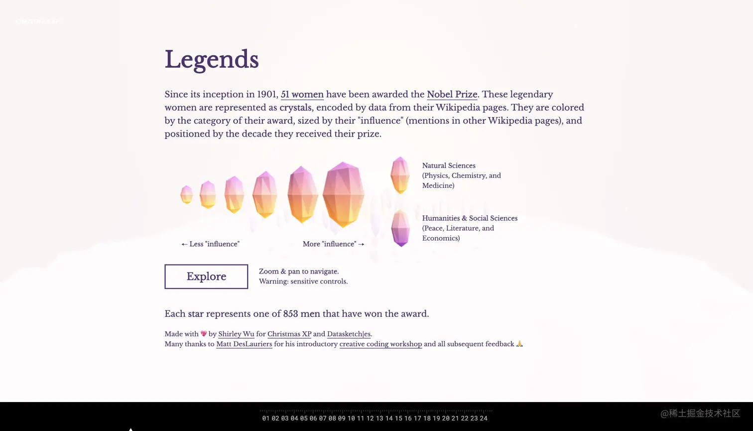 一晃又一个半月没写文章了,最近因为“妇女节”的缘故在重新看到Shirely Wu的诺贝尔奖女性获奖者相关的可视化作品 Legends 时,想着去 Data Sketches官网看看背后详细的实现文章,发现原本全部文章(24个可视化项目)都可以查看的,现在却只有10个项目的文章能看(有write-up标签)。