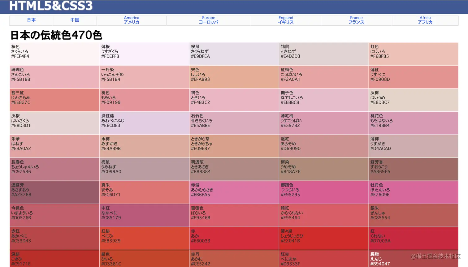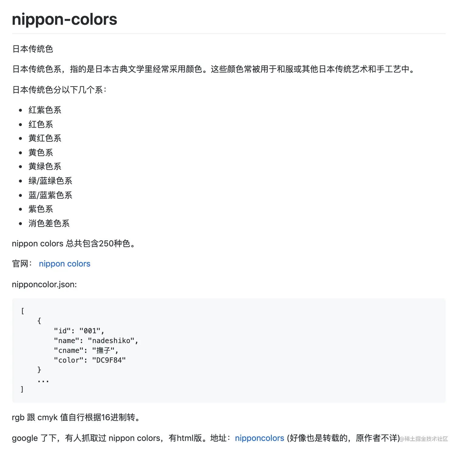 但又嫌麻烦,想来其它地方大概有现成数据,于是谷歌搜NIPPON COLORS、日本の伝統色等关键词,找到一些颜色汇总的网站,最终用了日本の伝統色470色 这个网站的数据。