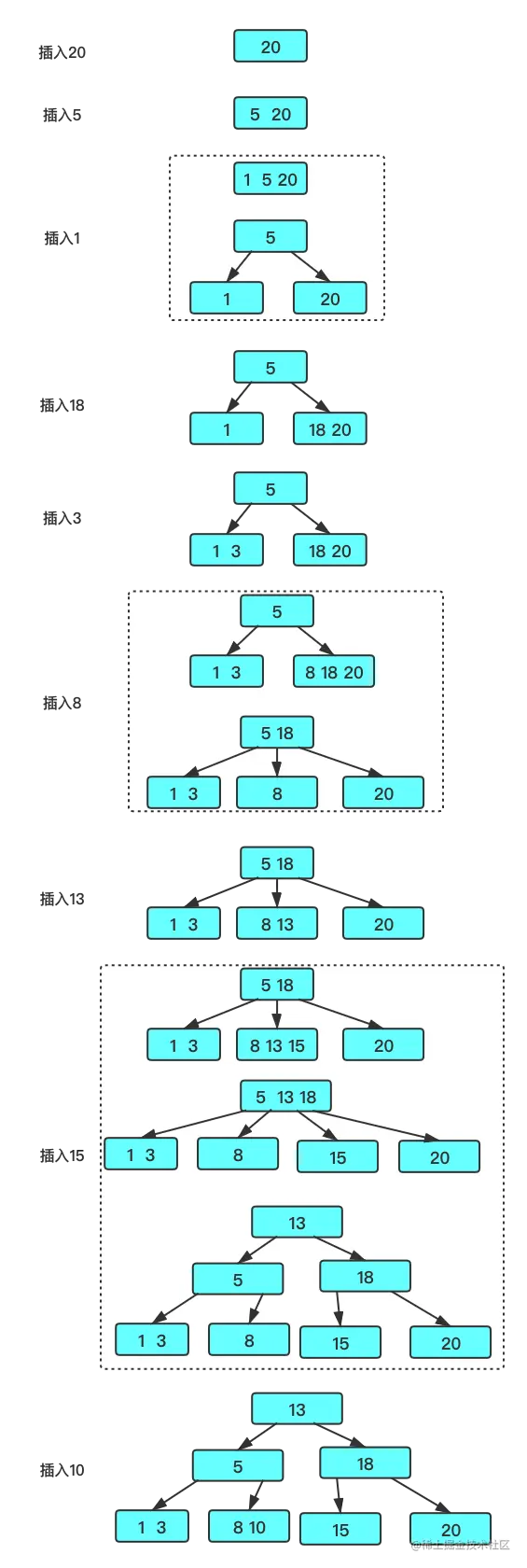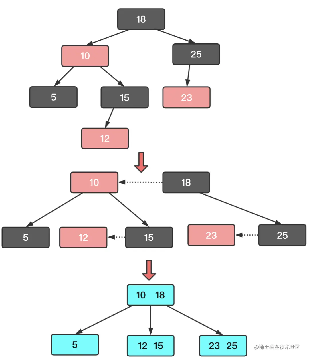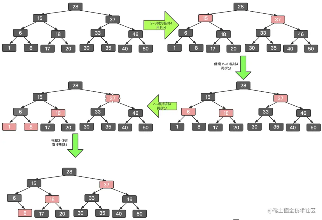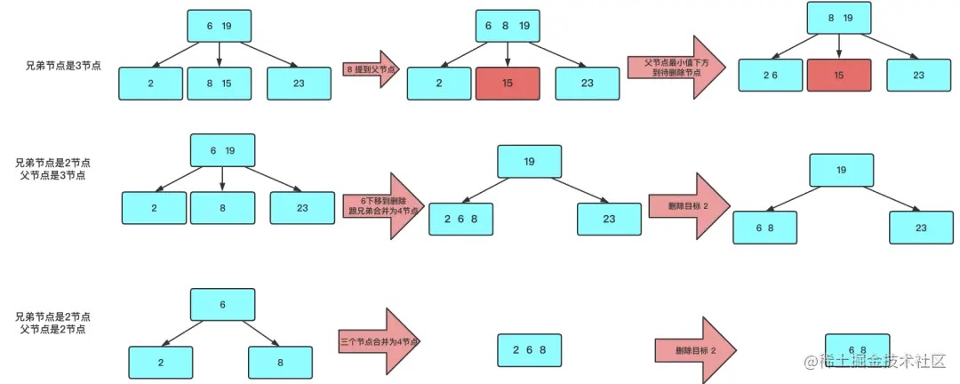 - 想办法让这个被删除的元素不可能出现在2节点中。如果发现删除元素树2节点则会从兄弟节点或父节点借个元素,当前2节点变为3节点或临时4节点,然后再删除目标数据。