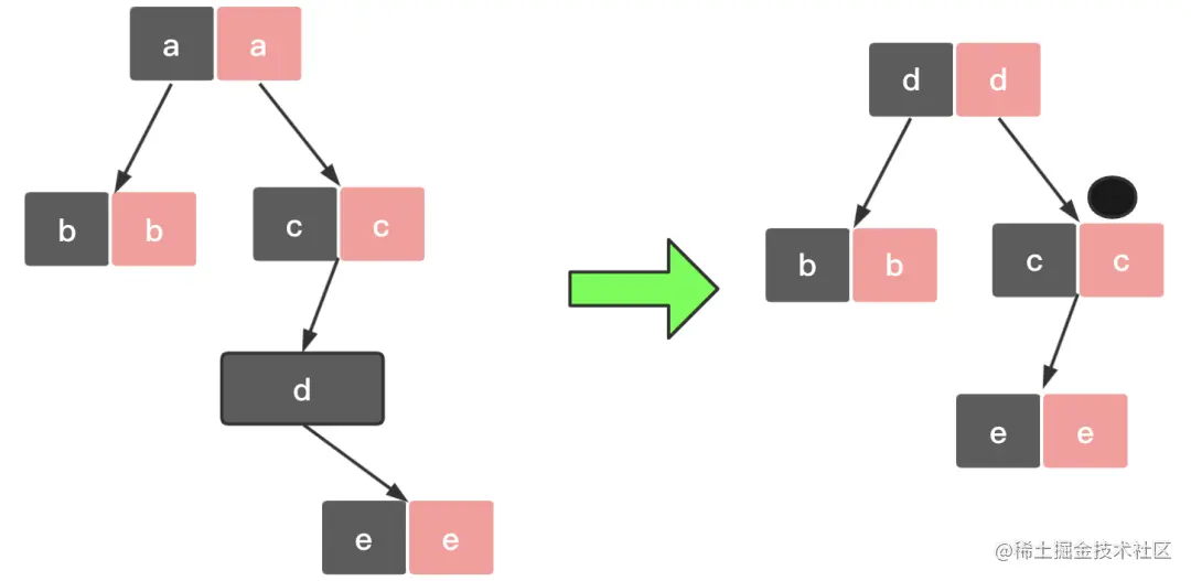 - 如果节点 a 的后继节点就是右子节点 c,那 c 肯定没有左子树。将c的颜色变为a的颜色,并且用c来覆盖a。