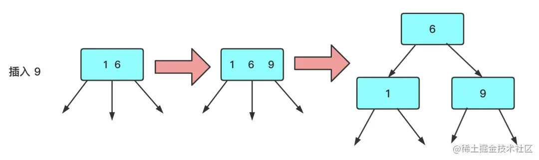 - 先找插入结点,若结点是2结点,则直接插入。如结点3结点,则插入使其临时容纳这个元素,然后分裂此结点,把中间元素移到其父结点中。对父结点亦如此处理。(中键一直往上移,直到找到空位,在此过程中没有空位就先搞个临时的,再分裂。)
