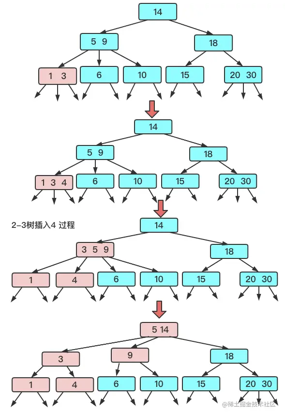 - 向一个父结点为3结点的3结点中插入新键4:跟上面套路类似,不断将中位数的数据往上提,直到遇到个2节点,或者到达了根节点然后进行拆分。
