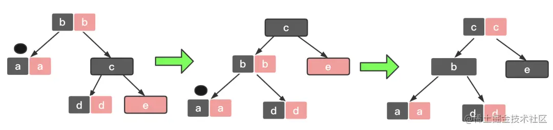 红 - 黑或者黑 - 黑 - 关注节点从 a 变成其父节点 b,继续从四种情况中选择符合的规则来调整。