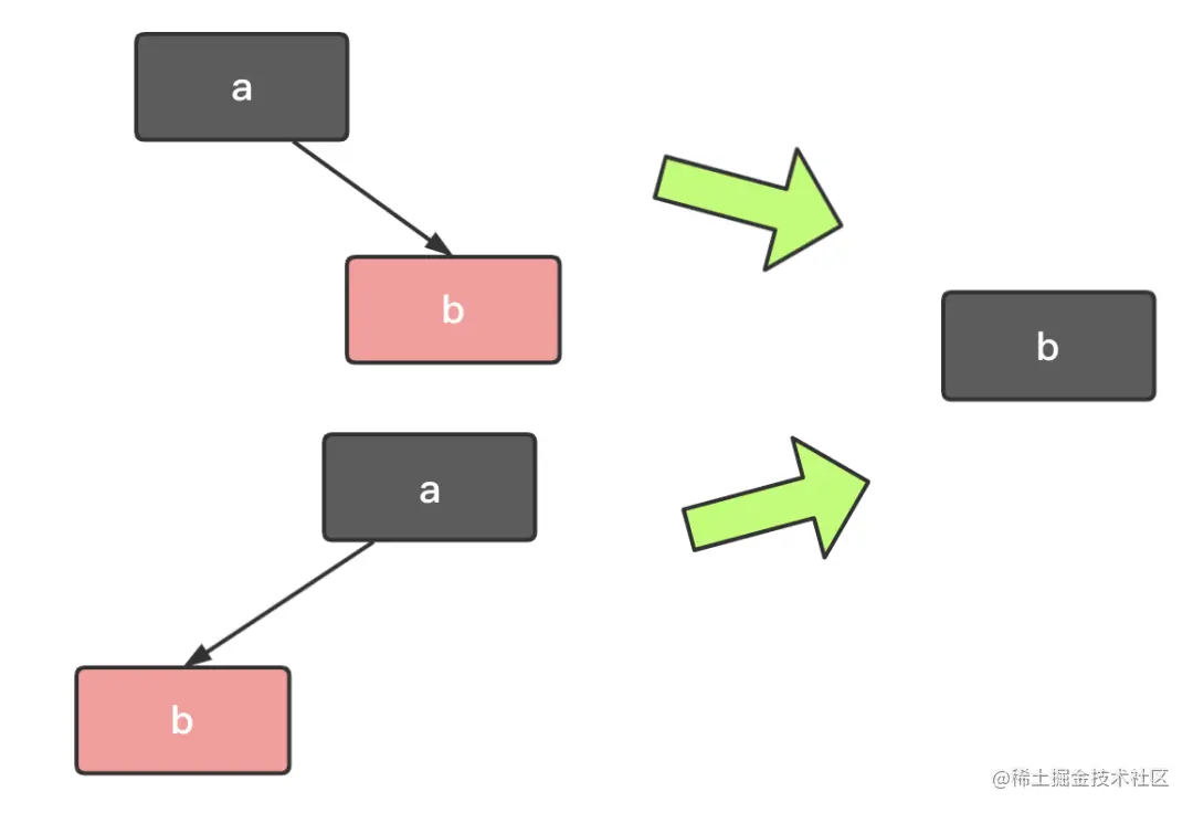 - 节点 a 只能是黑色,节点 b 也只能是红色,其他情况均不符合红黑树的定义。此时把节点 b 改为黑色。调整结束,不需要进行二次调整。