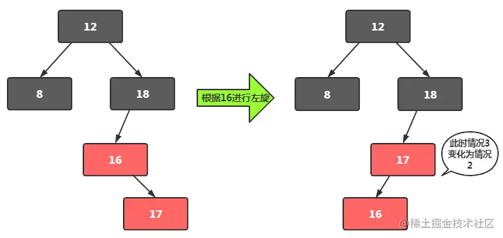 - 待插入元素比红父大,且红父自身就是左倾。待插入数据比红父左节点大,形成了右倾。通过左旋变成情况2处理。