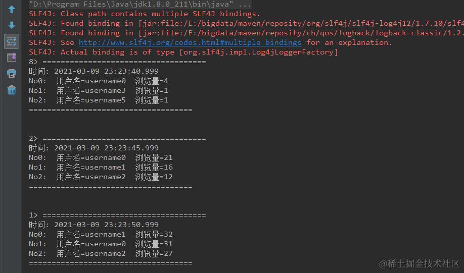 业务需求上,通常可能是一个小时,或者过去15分钟的数据,5分钟更新一次排名,这里为了演示效果,窗口长度取10s,每次滑动(slide)5s,即5秒钟更新一次过去10s的排名数据。