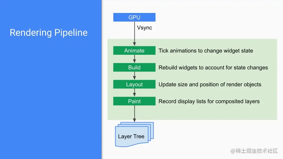 - Rendering 层,构建出渲染树 Render Tree,也即 RenderObject Tree,用于具体绘制,RenderObject 会自动随着数据改变而动态改变
