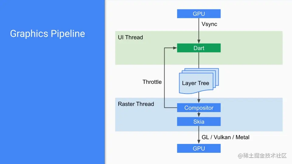 RasterThread 原本叫做 GPUThread,也是 Platform 创建的子线程,由于很多人误认为运行在 GPU 上,但其实它是运行在 CPU 用于处理数据提交给 GPU,所以 Flutter 团队将其名字改为 Raster,表明它的作用是光栅化。