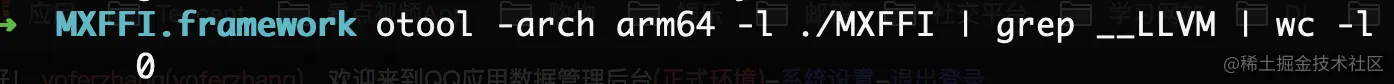 ➜ MXFFI.framework otool -arch arm64 -l ./MXFFI | grep __LLVM | wc -l