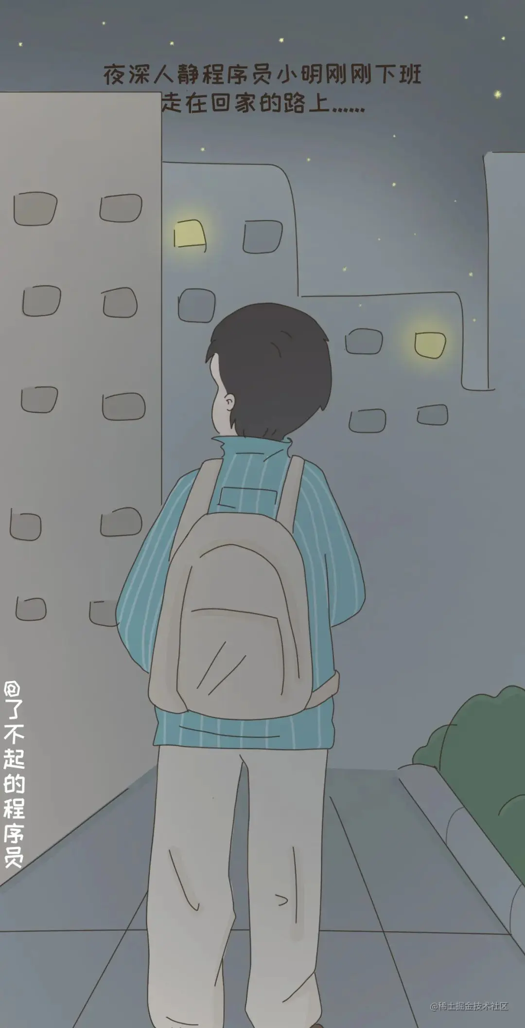 抬头望去,满眼尽是零零散散和你我一样低头赶路的加班人、伫立两旁为我们照亮脚下的路灯、远近楼群星星点点的灯光、和忽隐忽现眨着眼的满天繁星……
