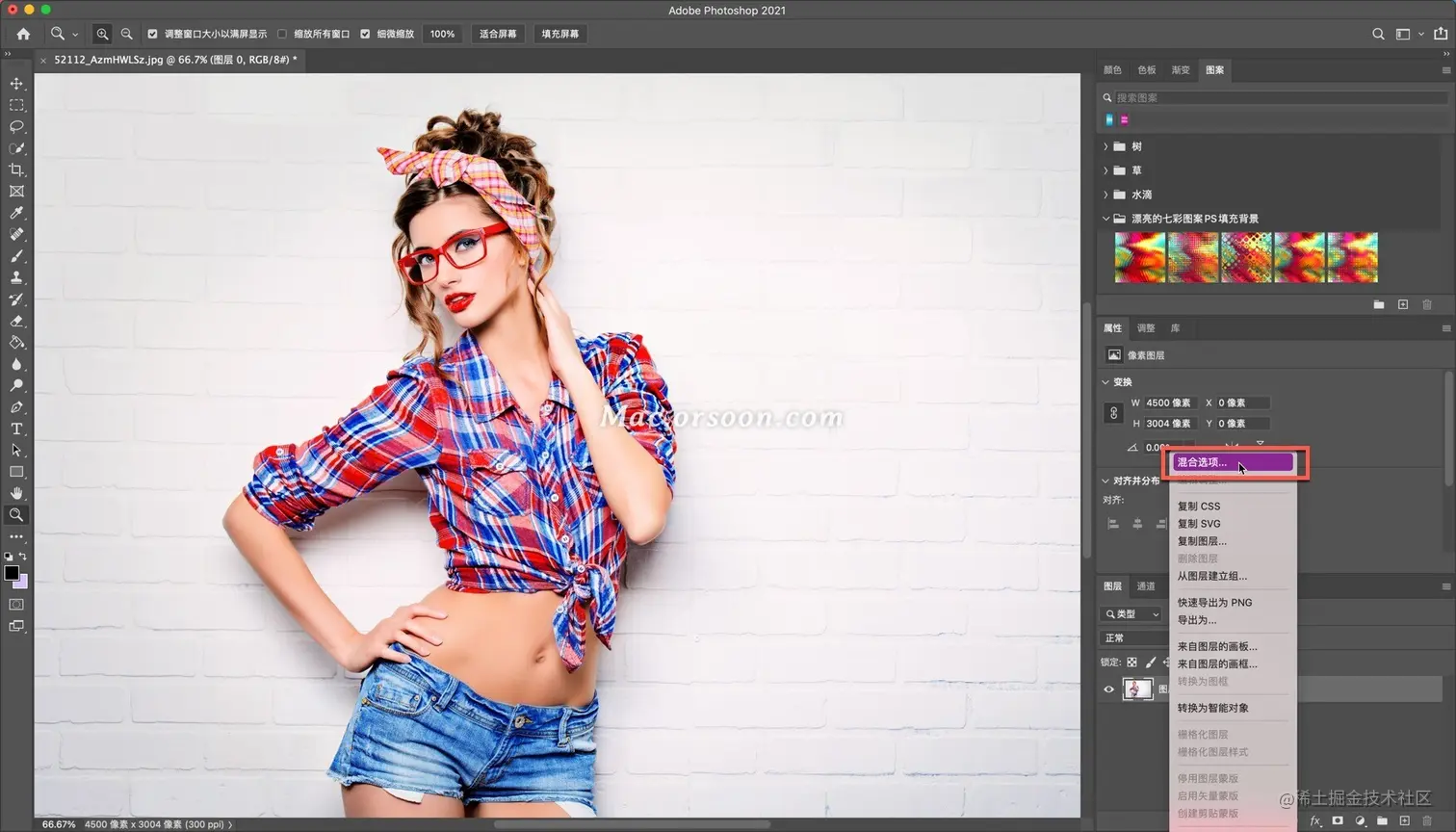 在PS中添加图片后,选中图层,将混合选项栏打开