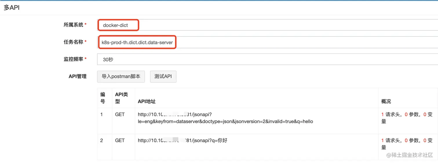 以词典查词服务为例,我们配置一条service级别的多API监控(也可以是单API监控)