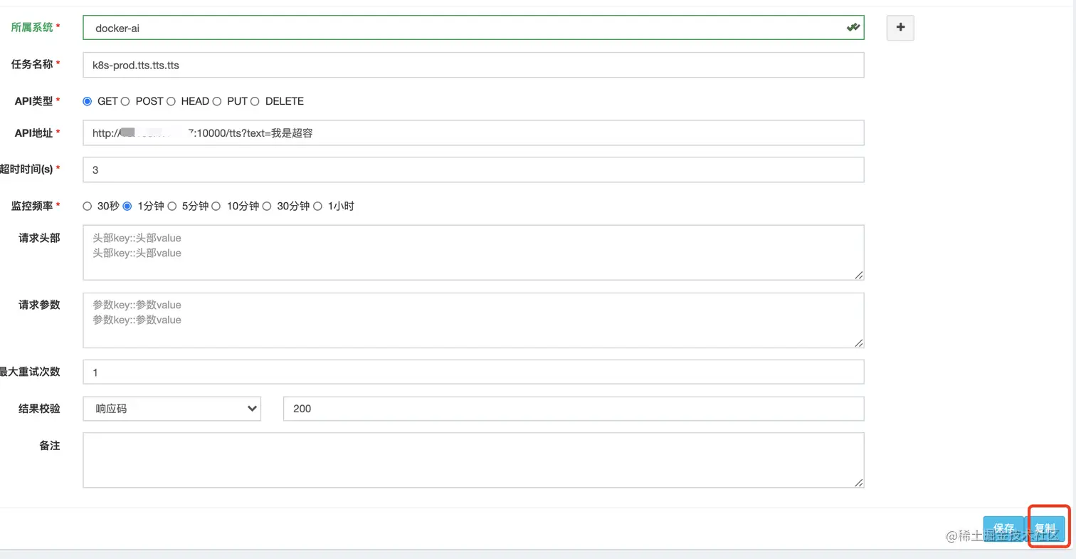增加复制等功能,打开一个已有的告警配置,修改后点击复制, 则可创建一个新的告警项 使用场景: 在多套环境(预发、灰度和全量)监控,以及从一个相似API接口微调得到新API监控