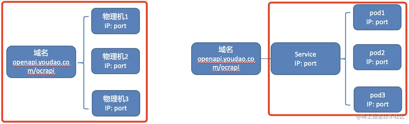 上图中,左边是物理机时代对应的功能监控,包括域名级别接口监控和3台物理机器监控。右边是对应的k8s环境,一个service的流量会由k8s负载均衡到pod1,pod2,pod3中,我们分别需要添加的是service和各个pod的监控。