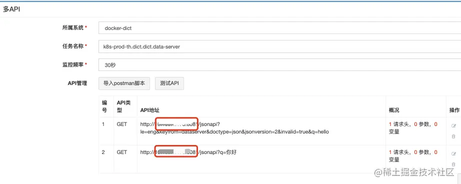 如下图所示,第一行监控里面监控的是图片翻译服务域名的地址,后边的是各台物理机的ip:端口。