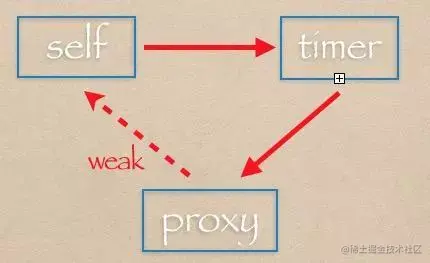 - 引入一个对象proxy,proxy弱引用 self,然后 proxy 传入NSTimer。即self 强引用NSTimer,NSTimer强引用 proxy,proxy 弱引用 self,这样通过弱引用来解决了相互引用,此时不会形成环
