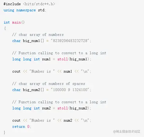 此函数将作为参数传递给函数调用的C类型字符串转换为长整型整数。它解析C字符串str,将其内容解释为整数,并作为long long int类型的值返回。该函数丢弃出现在字符串开头的空白字符,直到找到非空白字符为止。