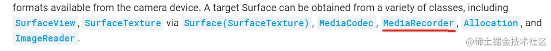 Android API文档(developer.android.google.cn/reference/a…)描述有下面这么一段话,我们可以看到MediaRecorder 的surface也是可以作为target Surface进行数据的请求的。那就很简单了,录像编码需要数据来源,而这个source就是通过MediaRecorder.getsurface,然后把该surface设置为target surface,那么MediaRecorder就可以拿到Camera数据了。