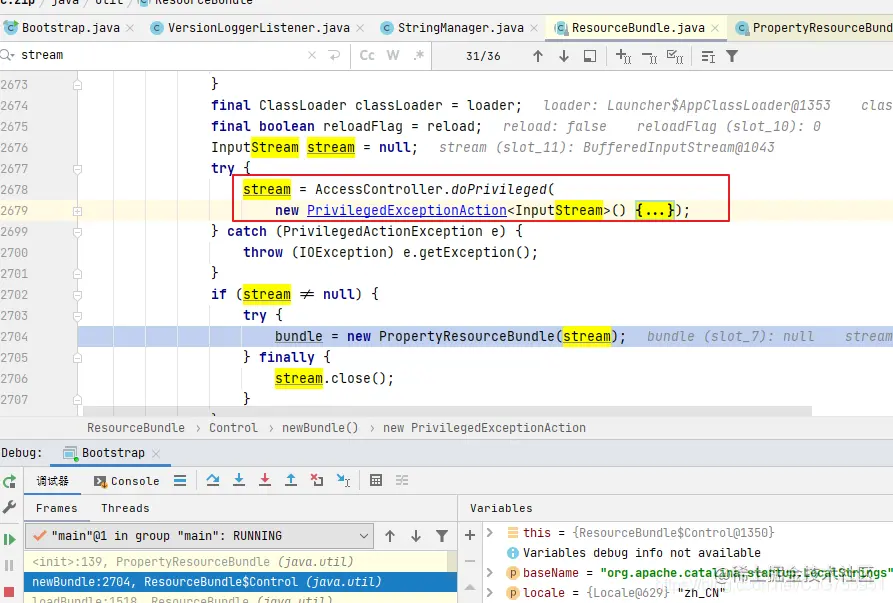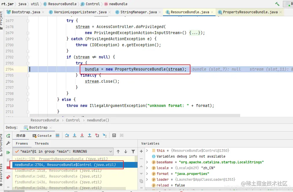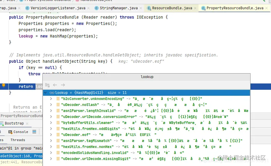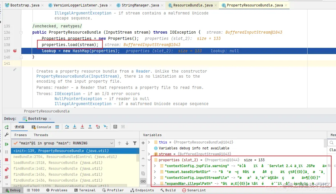 在这里我们可以看到他是通过输入流的形式来实现的,在下方的 Variables 窗口中可以看到 Properties 加载出来的数据已经是乱码的了