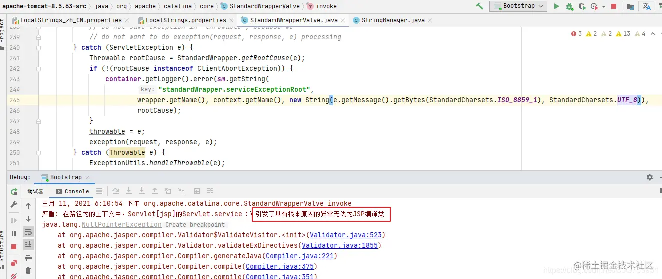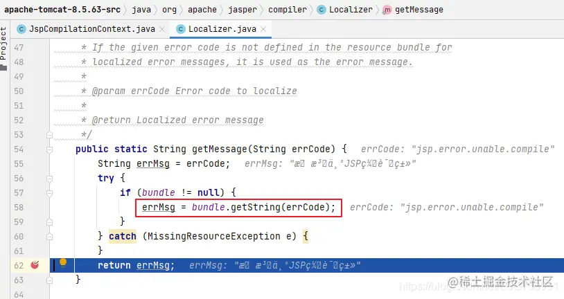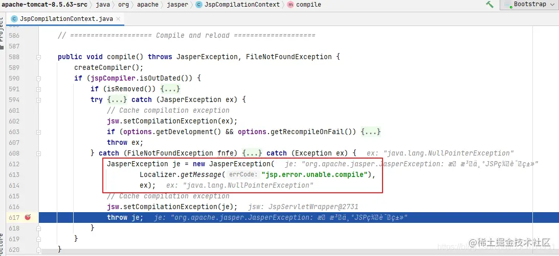 根据页面的提示找到 JspCompilationContext 类的 compile 方法,逐行查看,找到出错的地方