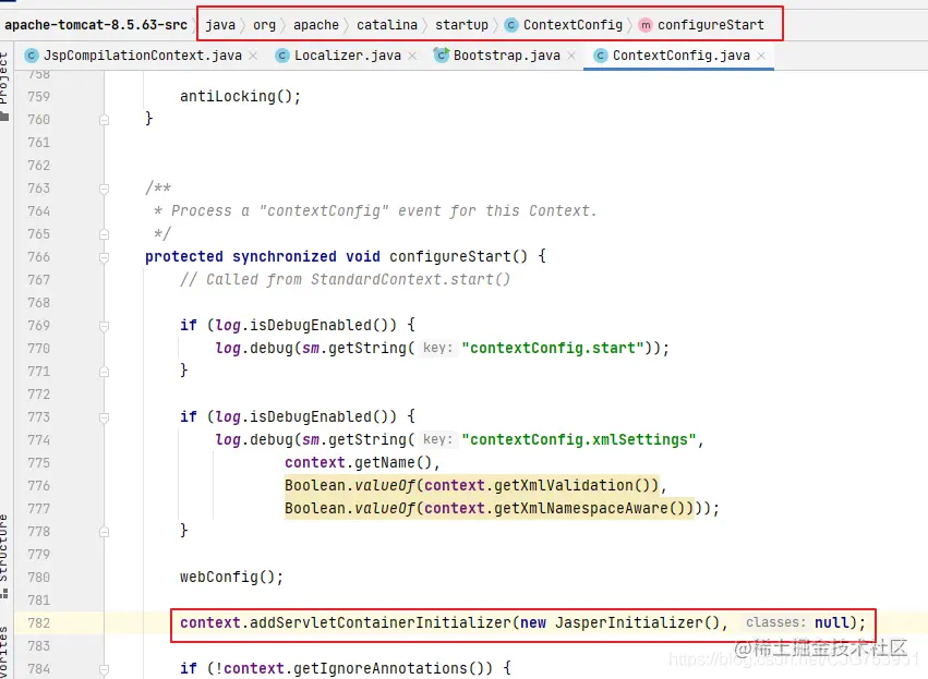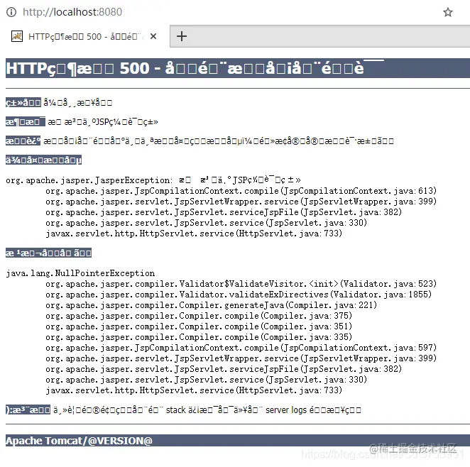 导致页面显示500状态码的原因是 Tomcat 源码中 jsp 引擎 Jasper 没有被初始化,从而无法编译处理 jsp (以为 jsp 是需要被转换成 servlet 进一步编译处理的),我们只需要在 Tomcat 的源码 ContextConfig 类的 configureStart 方法中把该引擎进行初始化即可,代码如下: