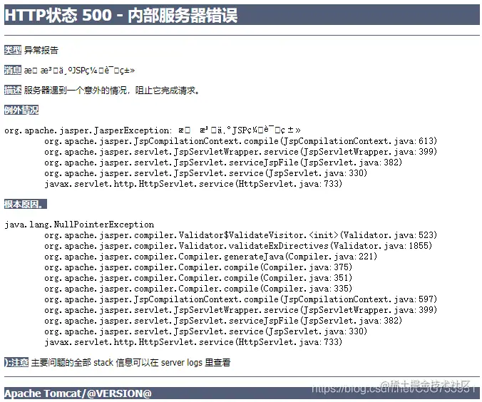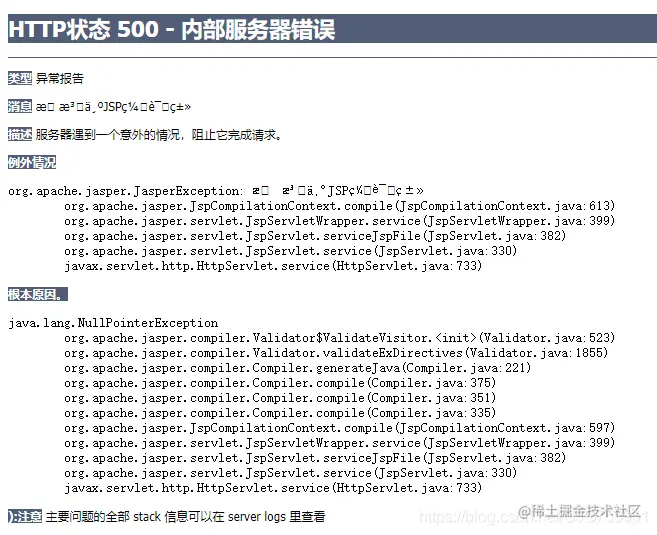 显示500状态码,给出的信息也很多是乱码,那我们来看一下是什么原因导致的吧。