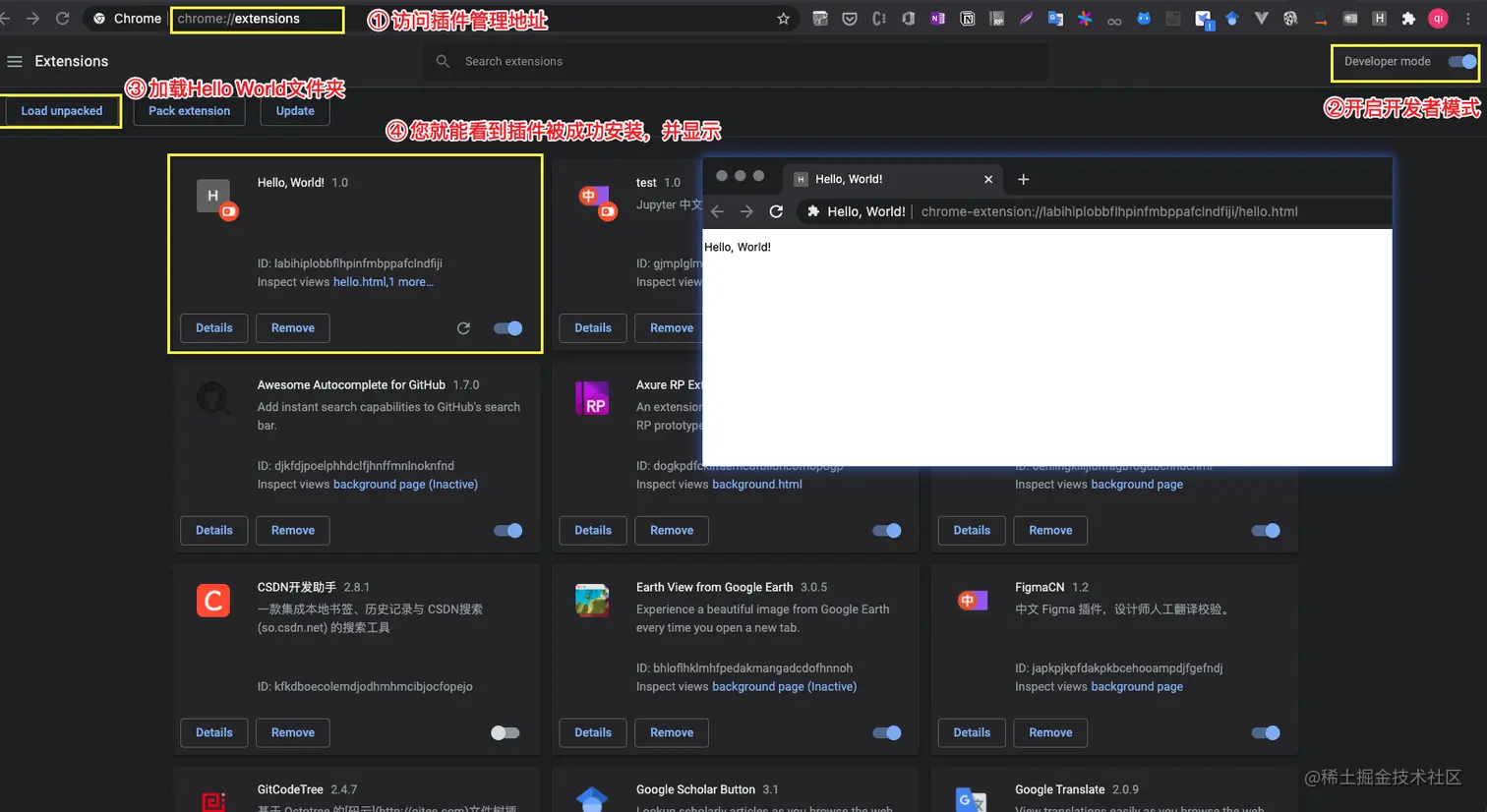 简单的代码,实现的功能就是安装完插件就打开 hello.html ,要想预览效果需要将本地浏览器的插件应用开启开发者模式。官方文档给出的步骤如下: