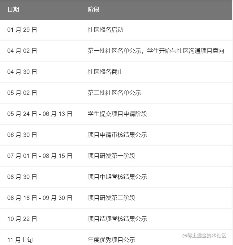 社区: 社区提供项目列表和描述,并安排项目对应的导师,导师与申请者沟通方案、并从申请者中选中一位承接项目。在为期三个月的开发周期中,导师指导学生进行对应项目的开发工作。
