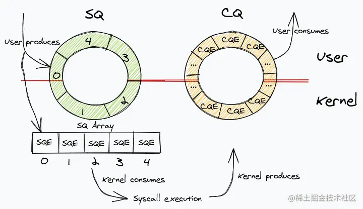 io_uring 实现异步 I/O 的方式其实是一个生产者-消费者模型: