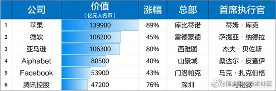 2020胡润世界500强榜数据显示:苹果公司以近14万亿人民币的市值成了世界上最具价值的公司,紧随其后的是微软和亚马逊。中国公司腾讯世界排名第六,成为中国市值第一的企业。从全球企业市值排名可以看出,排名靠前的基本上都是互联网公司。这说明,全球经济迎来了以数据为主导的时代。