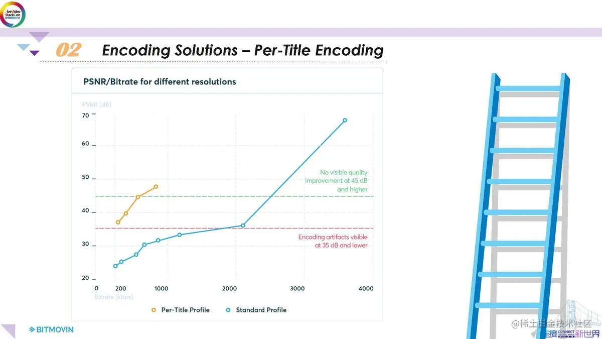 那我们如何合理分配解析度和编码率呢?上图展示的是PSNR的对比数据,PSNR就是图像质量水平的数据,图中橙色的就是通过Per-Title编码的设定,蓝色的是手动设定好的Profile。