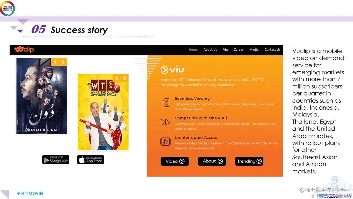 接下来我们讲我们客户的成功案例。PCCW是香港的一家电信公司。他们底下的一家公司叫做ViuTV(香港电视娱乐有限公司),其中有一款产品叫VuClip。他们在17个国家有OTT平台,在印度、印尼、马来西亚、泰国等这些国家都会有OTT平台,每季度的用户也超过700万个用户。用户可以在不同的平台上下载APP(ios、安卓),还有浏览器上也可以观看VuClip不同的节目和视频。