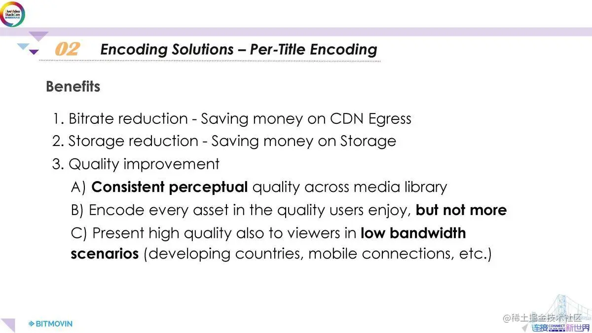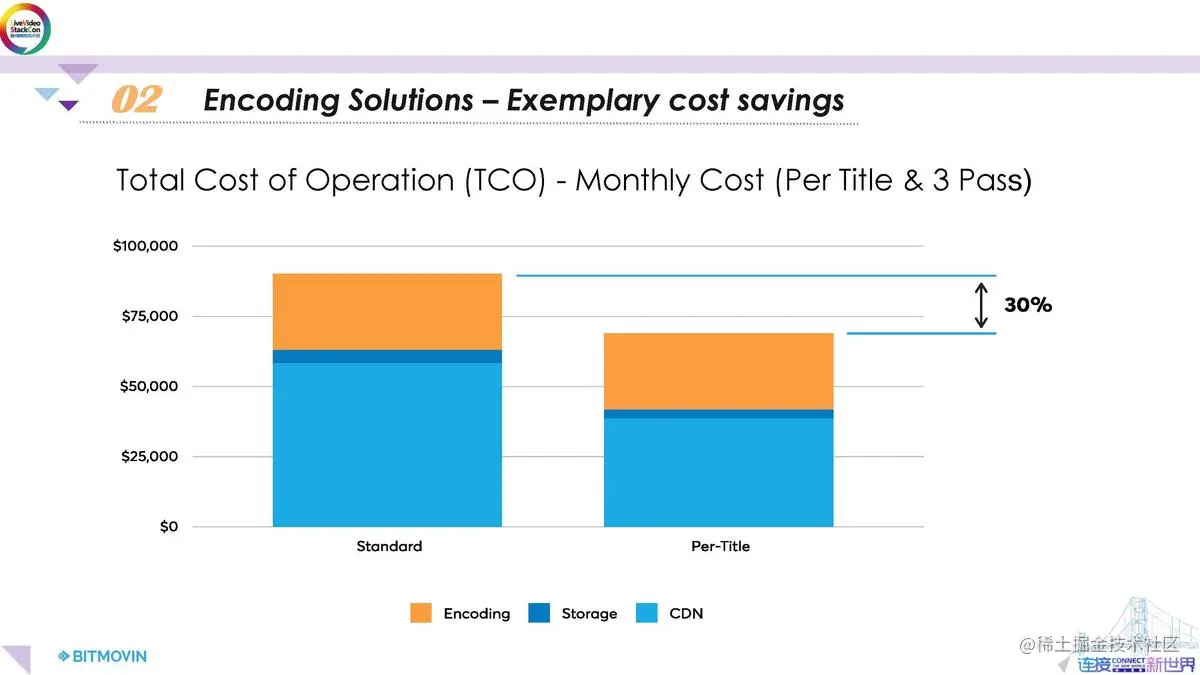 所以如果我们将3-Pass-Encoding和Per-Title一起使用,我们最终达到的优势就是把CDN的带宽还有存储的成本减少。