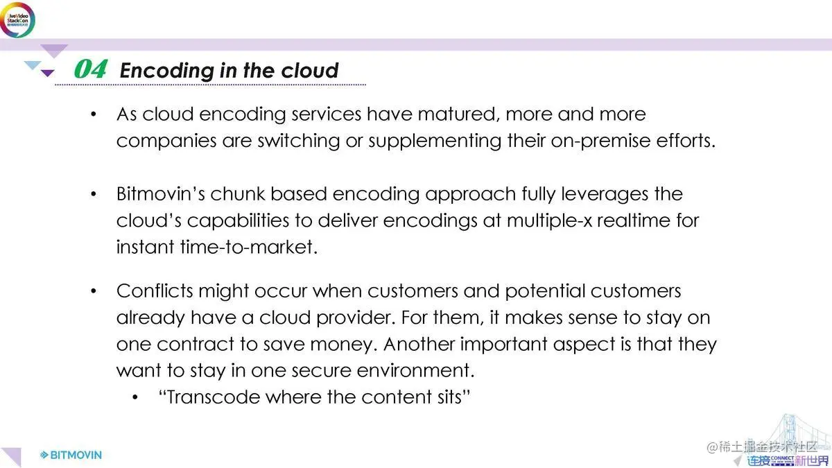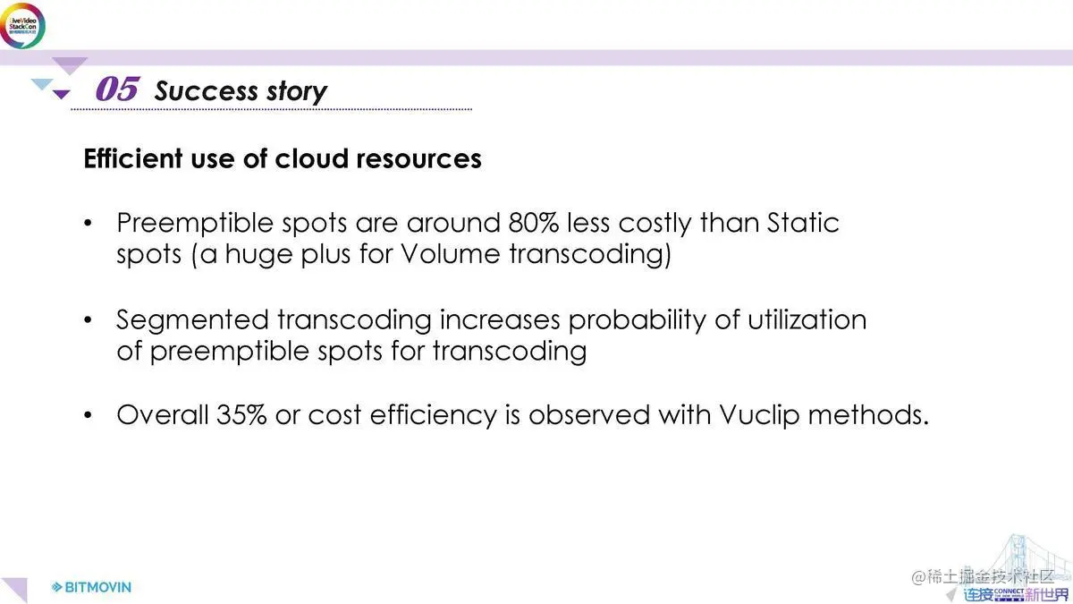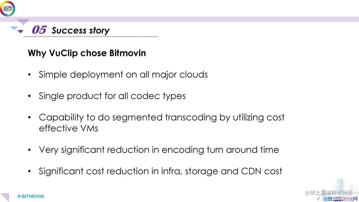 回顾一下今天所有的内容,云端编码技术越来越成熟的时候,更多客户都会选择使用云端的服务,因为可以减少基础设备的考量;Bitmovin的切片以及分配编码的这个过程,可以很有效率的利用云端去做编码,同时因为可以弹性的去打开很多机器,也可以很快速地编码一些很大的存储;那当我们有一些客户自己原来拥有云端资源时,他们完全可以把这些资源利用起来并且可以选择云端连接的方式去做他们的编码,同时他们也可以把视频留在他们的环境里以此降低成本。我们在VuClip的客户观察到用这些方式可以降低35%的成本。