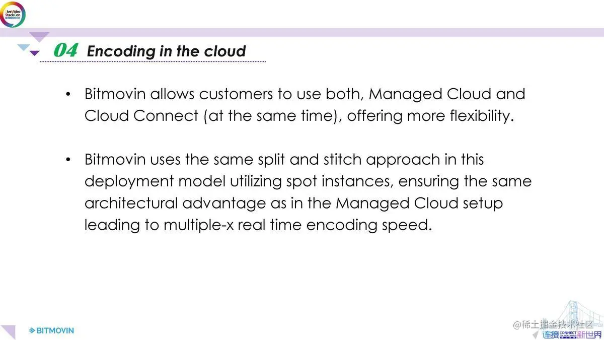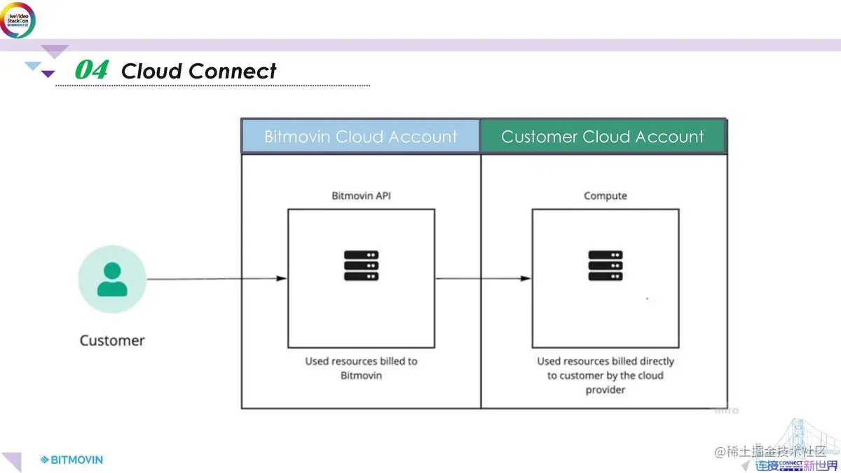 另外一个模式就是Customer Cloud Account的模式也就是云端连接的模式。云端连接和Managed Cloud最大的区别就是当客户选择用这个Cloud Connect这个模式的时候,他是通过同样的Bitmovin的API去踢开编码的过程。但是实际情况下那个编码的过程是在客户拥有的云端平台上发生的,对于这些有自己云端平台的客户,他们就可以通过Cloud Connect去使用Bitmovin的编码功能。这样做的好处是可以进一步降低成本,因为用户是通过他们拥有的合约继续使用他们的资源。