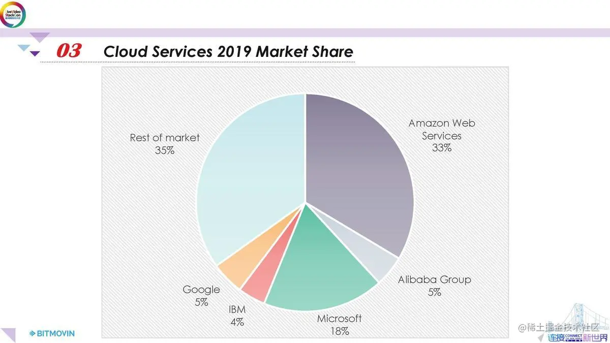 上图是我们在2019年对云端市场占有率的数据,在众多云端平台上,占有率最大是亚马逊公司;排名第二是微软,它的占有率有18%;接下来是谷歌和阿里巴巴分别在市场上有5%。