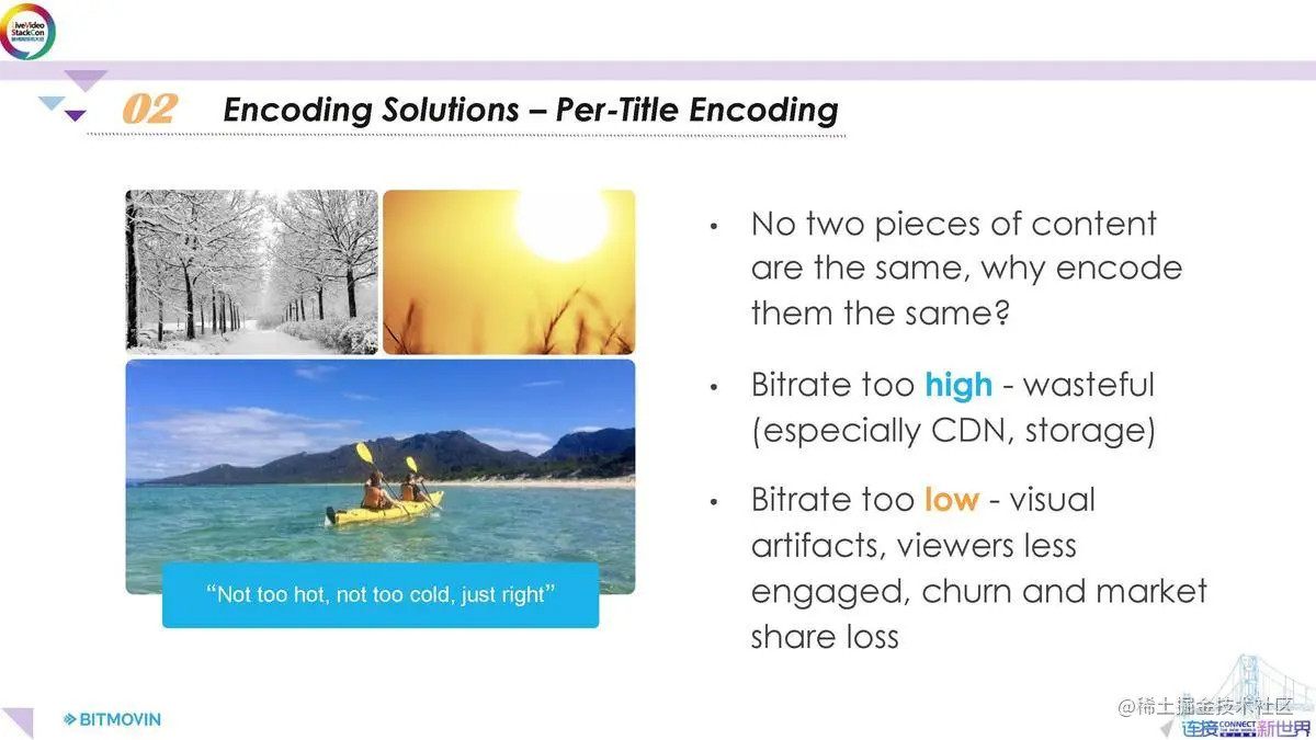 我们在低码率的情况下,比如左侧200K的情况下,它的图像质量30以下,因为我们在比较低的编码率的时候都会设计一些比较低的解析度。但是通过Per-Title不同的图像可以分配更加适当的解析度。