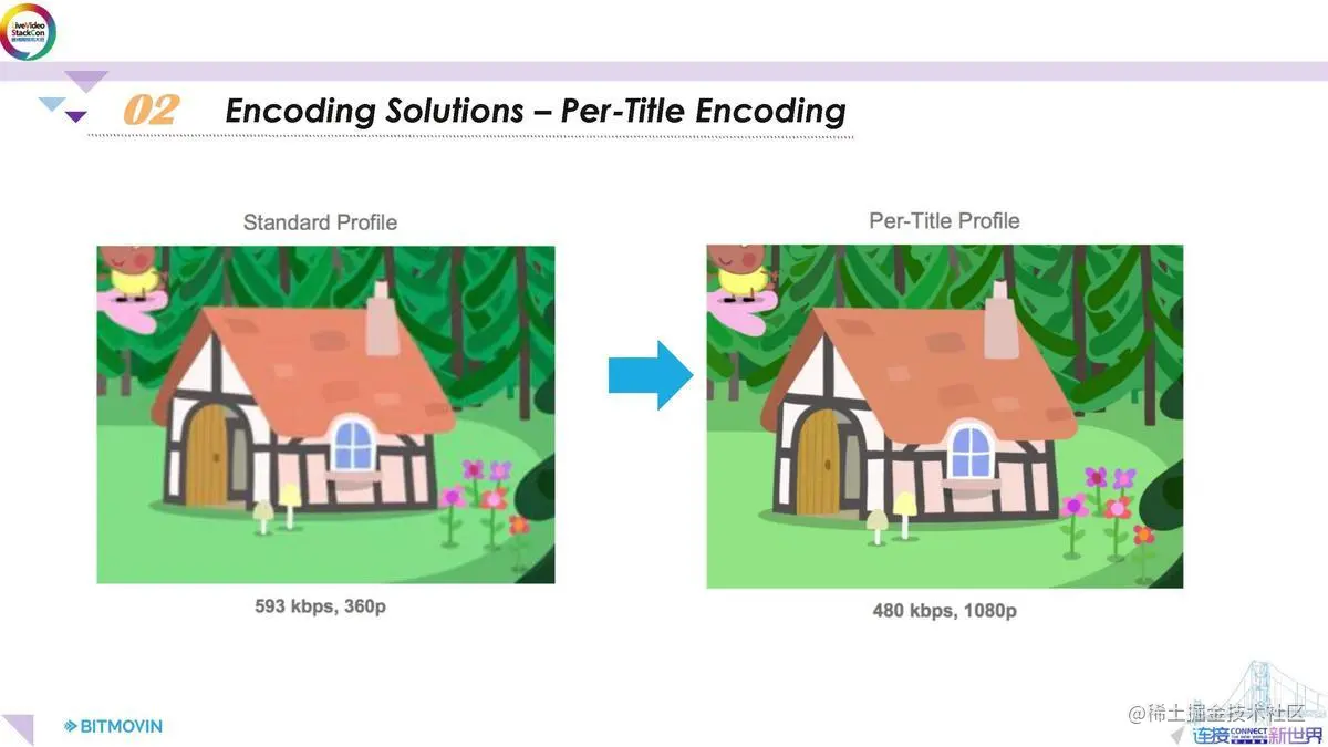 所以我们以PPT上的图片为例。平时做设定时,我们会把比较低码率的设定成低解析度的。我们在这里看到一个360p的视频,我们分配600kbps去编码。但是其实同样的视频可以通过比较低的码率就可以编码成到高清的效果,这究竟是为什么呢?