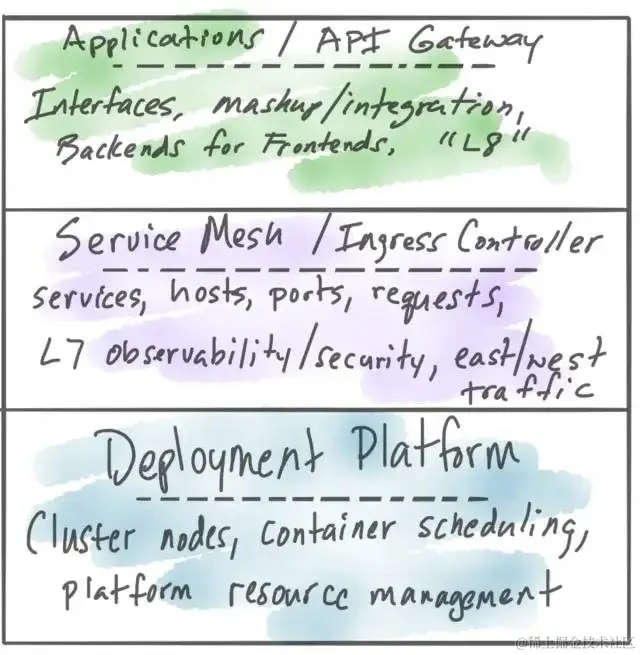 在这个层级,我们可能希望某种“入口网关”成为允许请求和消息进入集群的流量监控人。在这个层级,思考更多的是“我的集群中有此服务,我需要集群外的人能够调用它”。这可能是服务(公开API)、现有的整体组件、gRPC服务,缓存、消息队列、数据库等。有些人选择将其称为API网关,而且实际上可能会做比控制流量进/出而言更多的事情,但重点是这个层级的问题是属于集群操作级别的。
