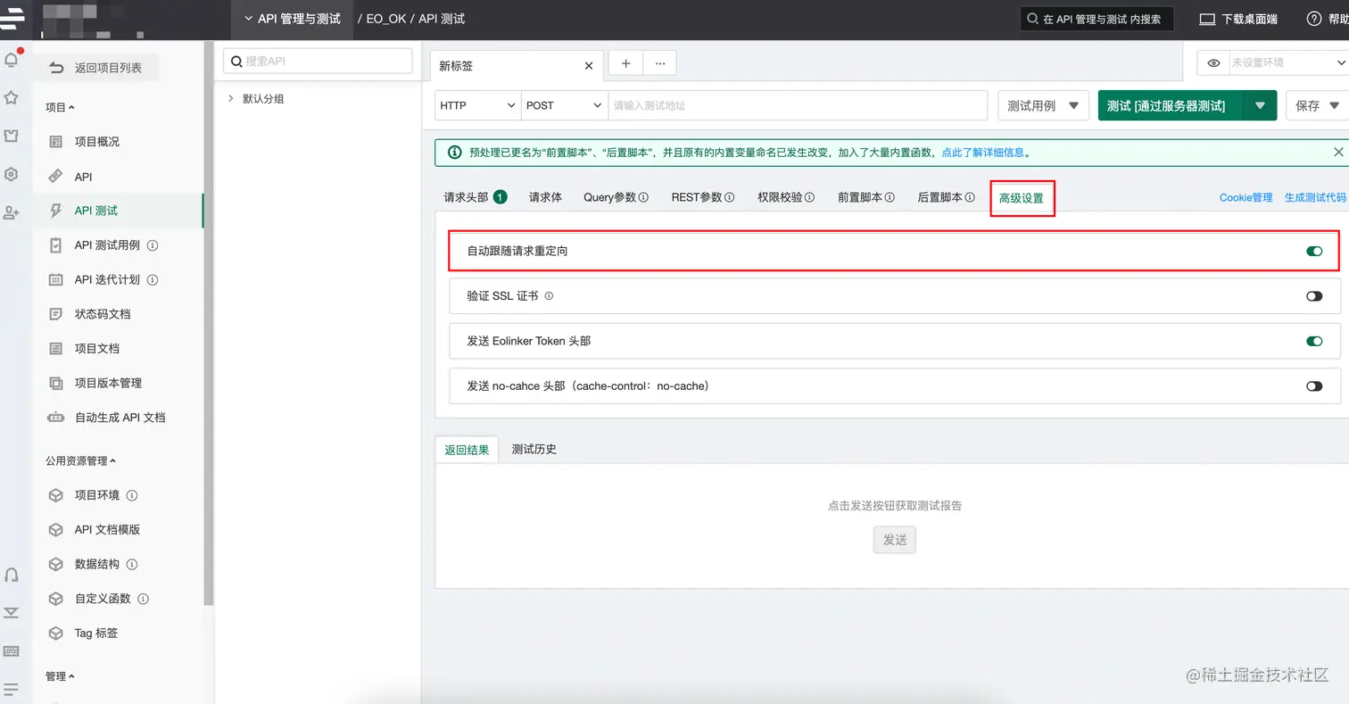 本周的问题是关于接口重定向的。 在进行接口测试的时候,遇到了自动重定向的接口,只想测试本接口的,不希望跳转到重定向的页面。比如301、302重定向 301重定向又称之为永久性转移 301转向(或叫301重定向,301跳转)是当用户或搜索引擎向网站服务器发出浏览请求时,服务器返回的HTTP数据流中头信息(header)中的状态码的一种,表示本网页永久性转移到另一个地址。 302重定向又称之为暂时性转移(Temporarily Moved ) 302状态码应用的典型场景是服务器页面路径的重新规划 比如一个portal页面,换了新的域名,但是老的域名地址还有很多用户在使用,这样可以对老域名配置302跳转到新域名地址,保证服务的延续。 另外对于一些客户端预埋的Url链接,免不了老版本地址失效与更改,将老地址配置302跳转到新地址,这样就能够全面兼容所有客户端版本。